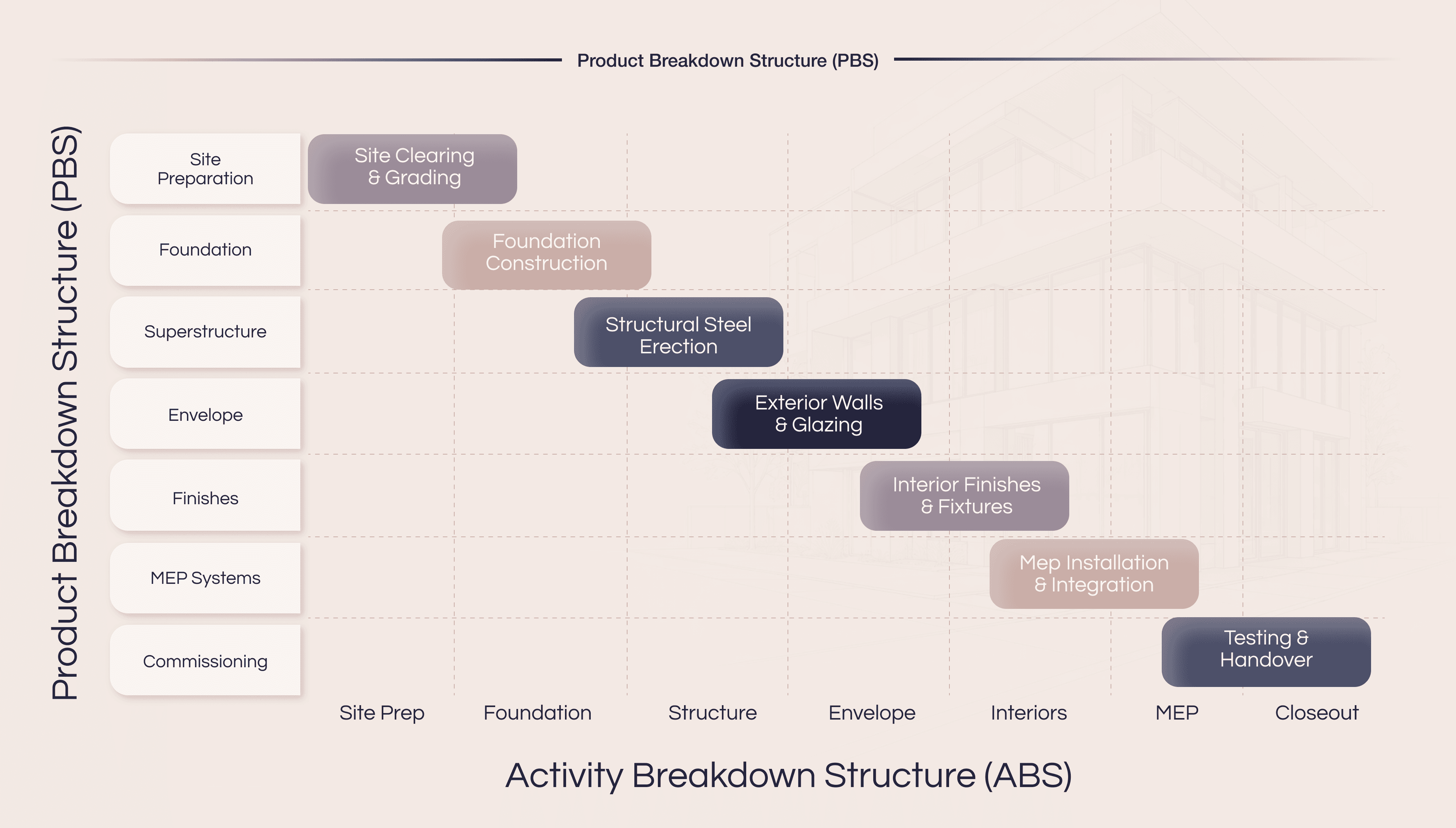 A construction WBS is often developed from two perspectives: Product Breakdown Structure (PBS) and Activity Breakdown Structure (ABS).